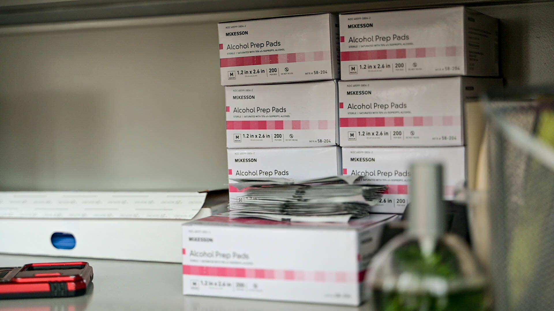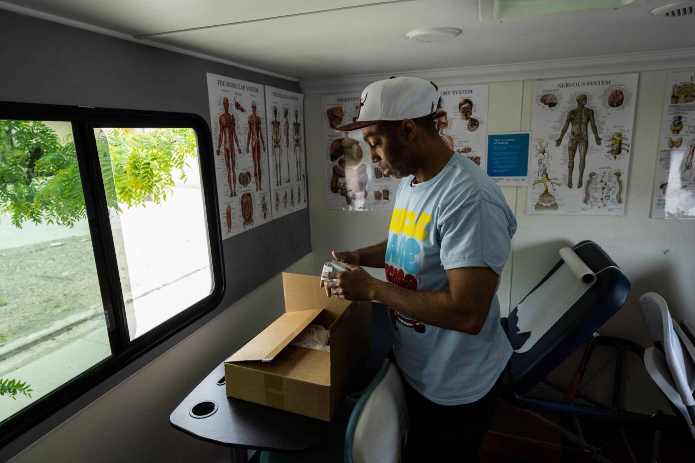 COIP Clinical Services Coordinator Albert Murphy BA ’15, MPH ’20 looks through a box of drug tests in one of COIP's mobile units. Photo: Anthony Jackson